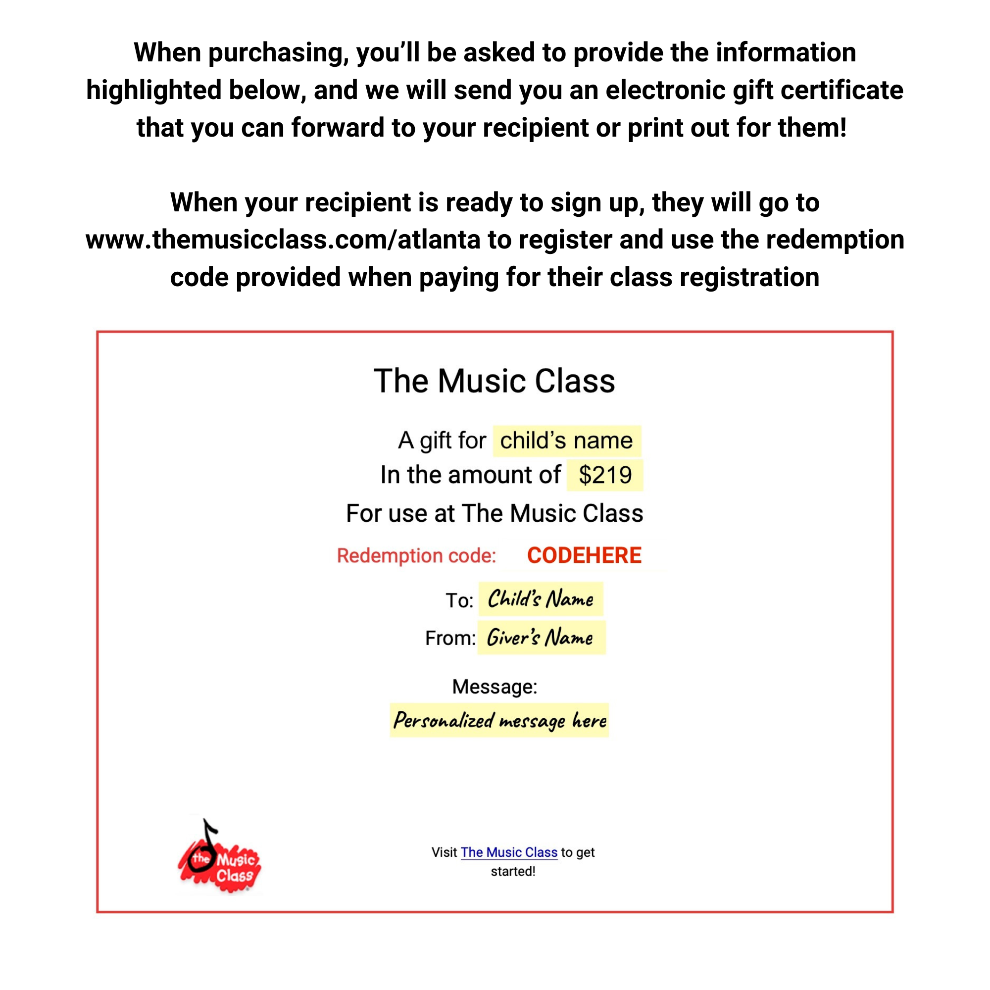 Gift certificate are redeemable towards classes at The Music Class in Atlanta, GA. These can only be redeemed at www.themusicclass.com/atlanta.